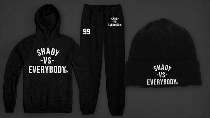 This bundle includes limited edition Shady Vs. Everybody sweatshirt, sweatpants, and beanie.