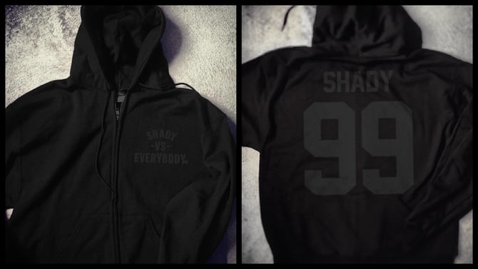 Black On Black Shady Vs. Everybody Champion Hoodie for Black Friday. Available starting at Midnight EST for 24 hours only. After that, this edition will no longer be available and never made again. Custom made on high quality, heavyweight Champion zip up hoodies. *Black Friday Discounted Price Is $50. **$1 of every Shady Vs. Everybody hoodie purchased will go to the Marshall Mathers Foundation!